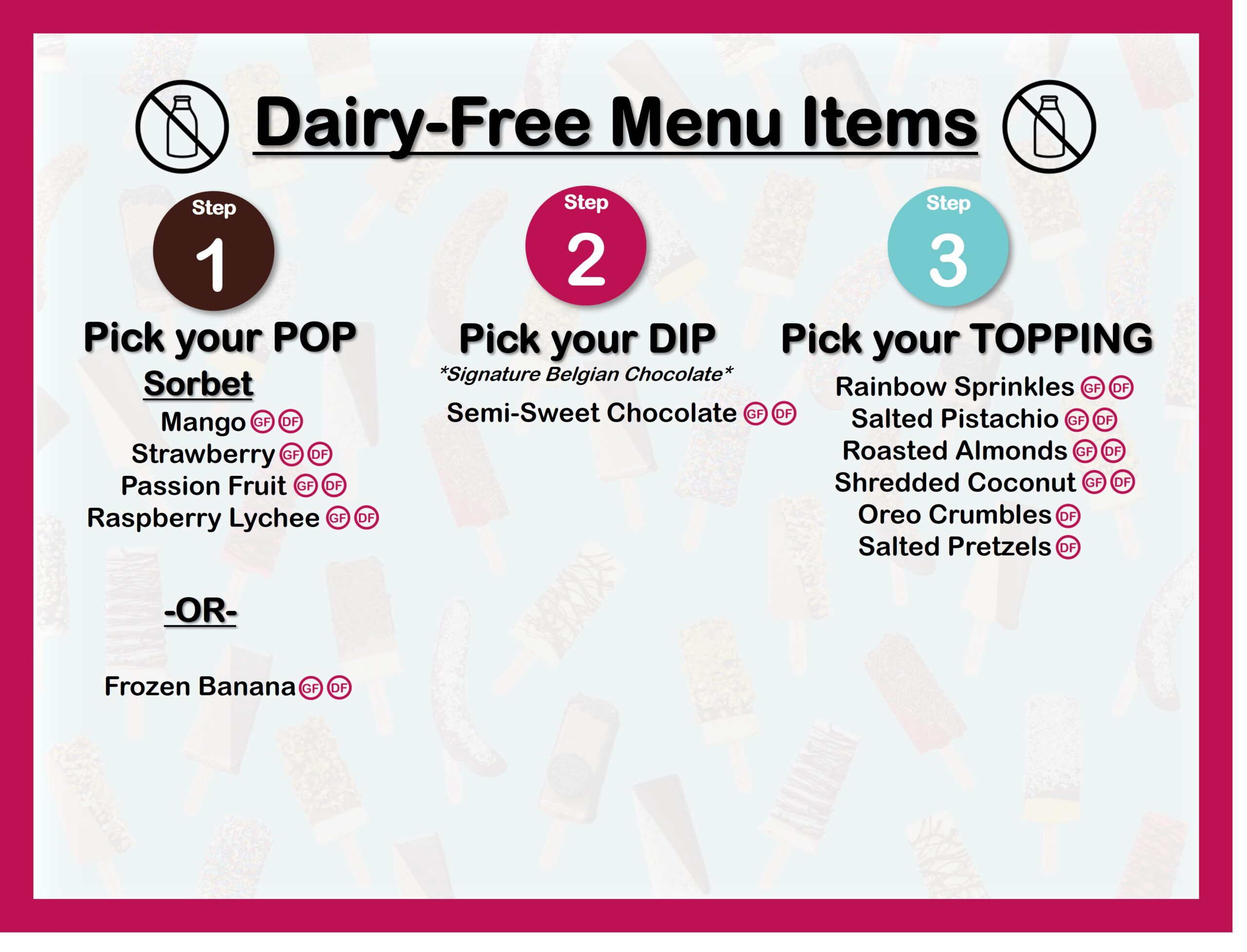** We produce our sorbet POPs in a separate machine than we do our gelato POPs. Some ingredients in our gelato POPs contain nuts (Pistachio, Nutella, Coconut), we DO thoroughly wash our all production machines between “batches” to ensure purity in flavor and prevent cross-contamination as much as possible. Pure sorbet POPs are recommended for severe nut allergies **