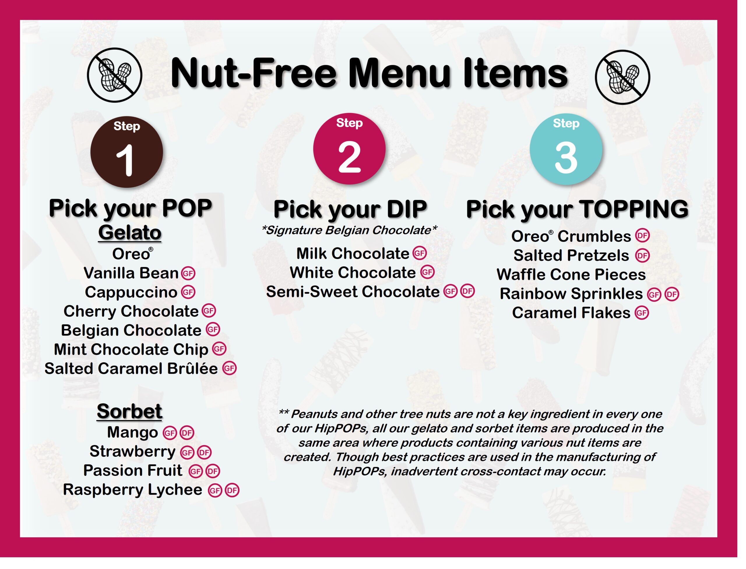 At HipPOPs, we’re passionate about providing a wide variety of options while prioritizing the needs of every individual, regardless of dietary restrictions or allergy requirements. Developing a school-safe menu and including adequate allergy info is a top priority.
